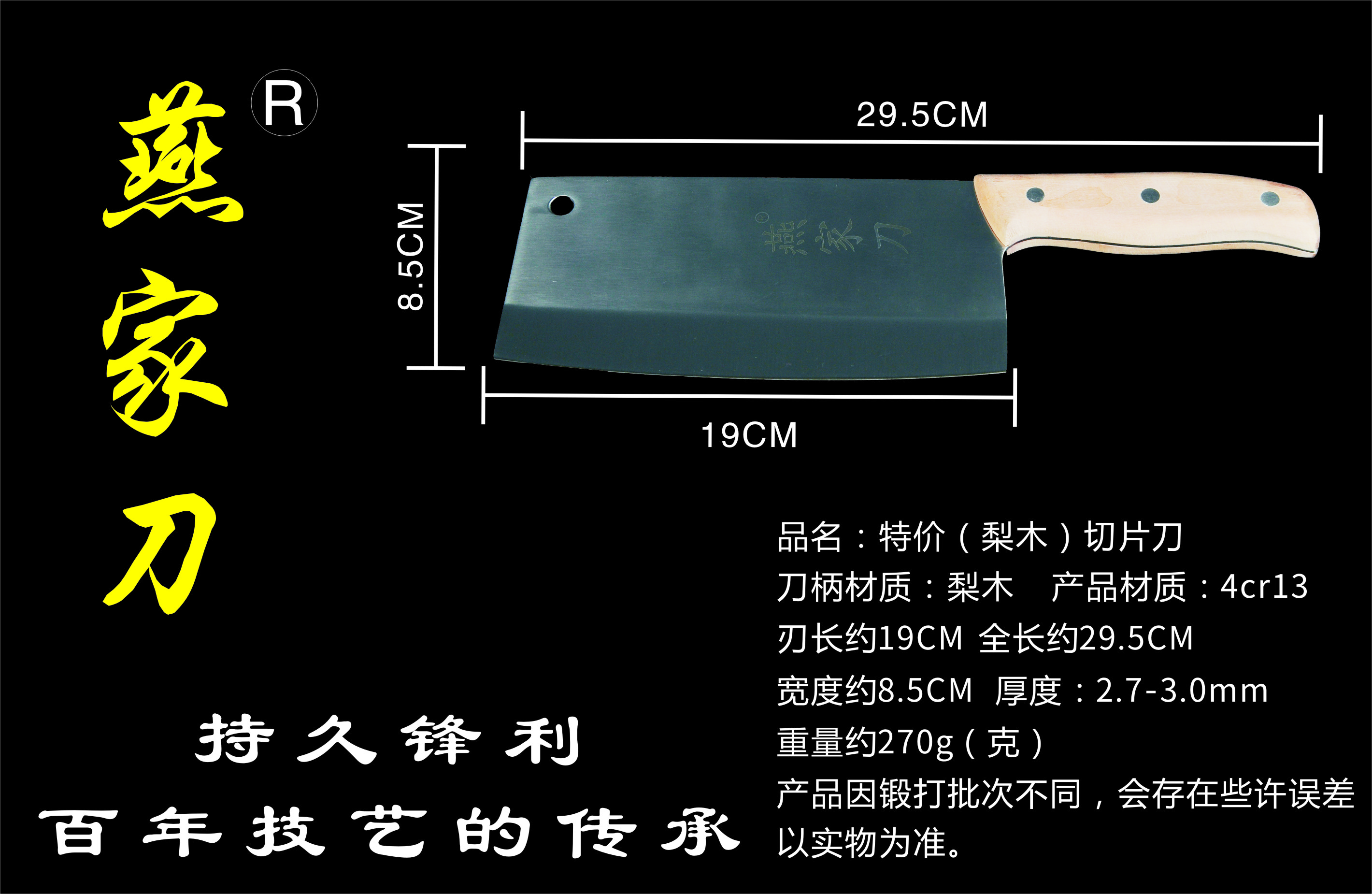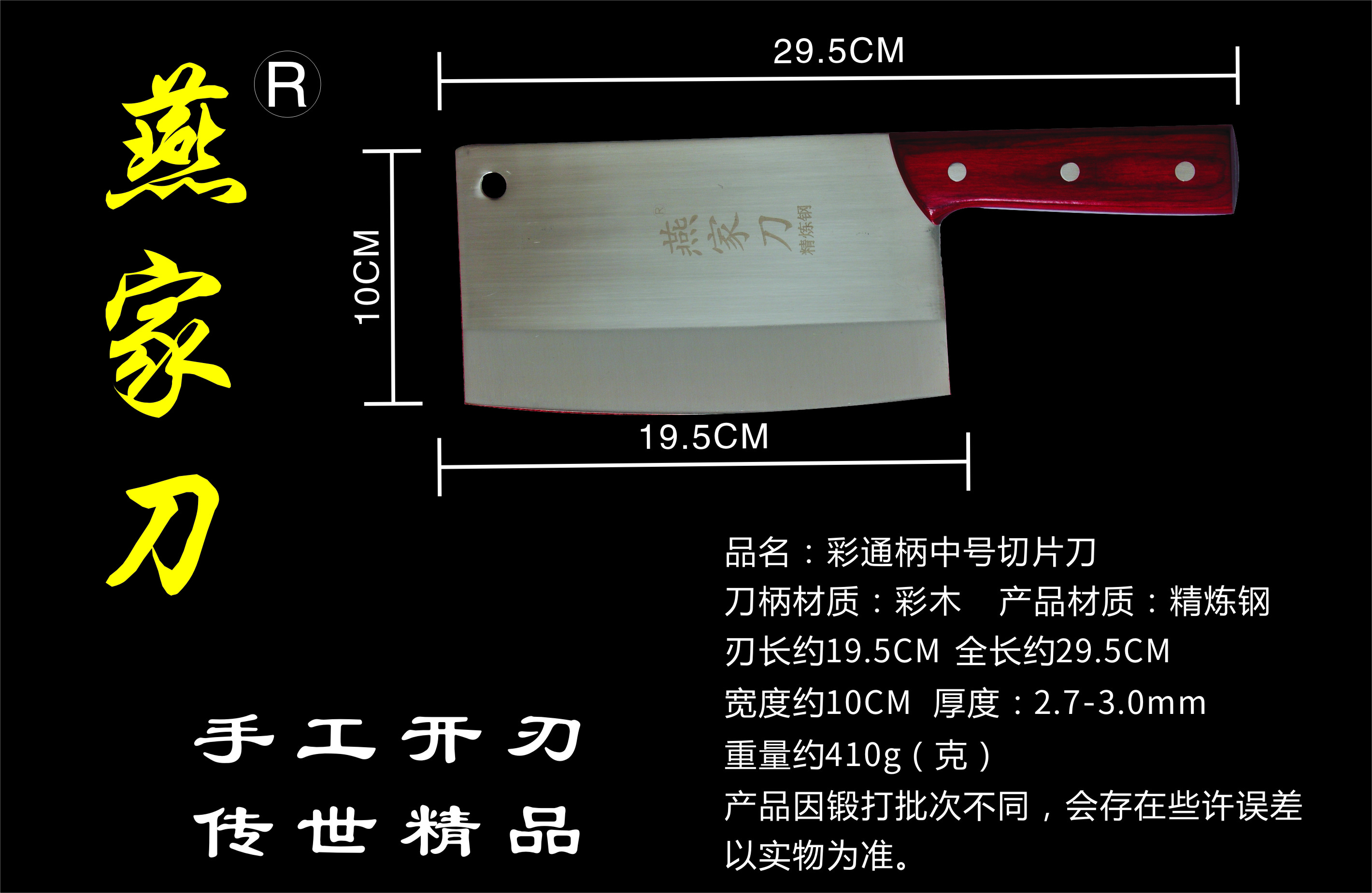 樂山燕家刀具有限公司(公司前身為燕佳鐵匠鋪),公司坐落于美麗的佛都之鄉(xiāng)樂山嘉州,在全國各地有上千家代理經(jīng)銷點(diǎn),公司專業(yè)銷售、設(shè)計(jì)、制作各類刀具。秉承一貫鍛造三精要求,即選料精、用料精、工藝精。所選材料全部產(chǎn)自滇東鐵礦優(yōu)產(chǎn)區(qū)。本品牌刀具堅(jiān)持千挑萬選為材,千錘百煉為刀的手工鍛造工藝宗旨。具有鋒利耐磨、持久耐用,用料上乘,硬度高、韌度強(qiáng)的特點(diǎn)!